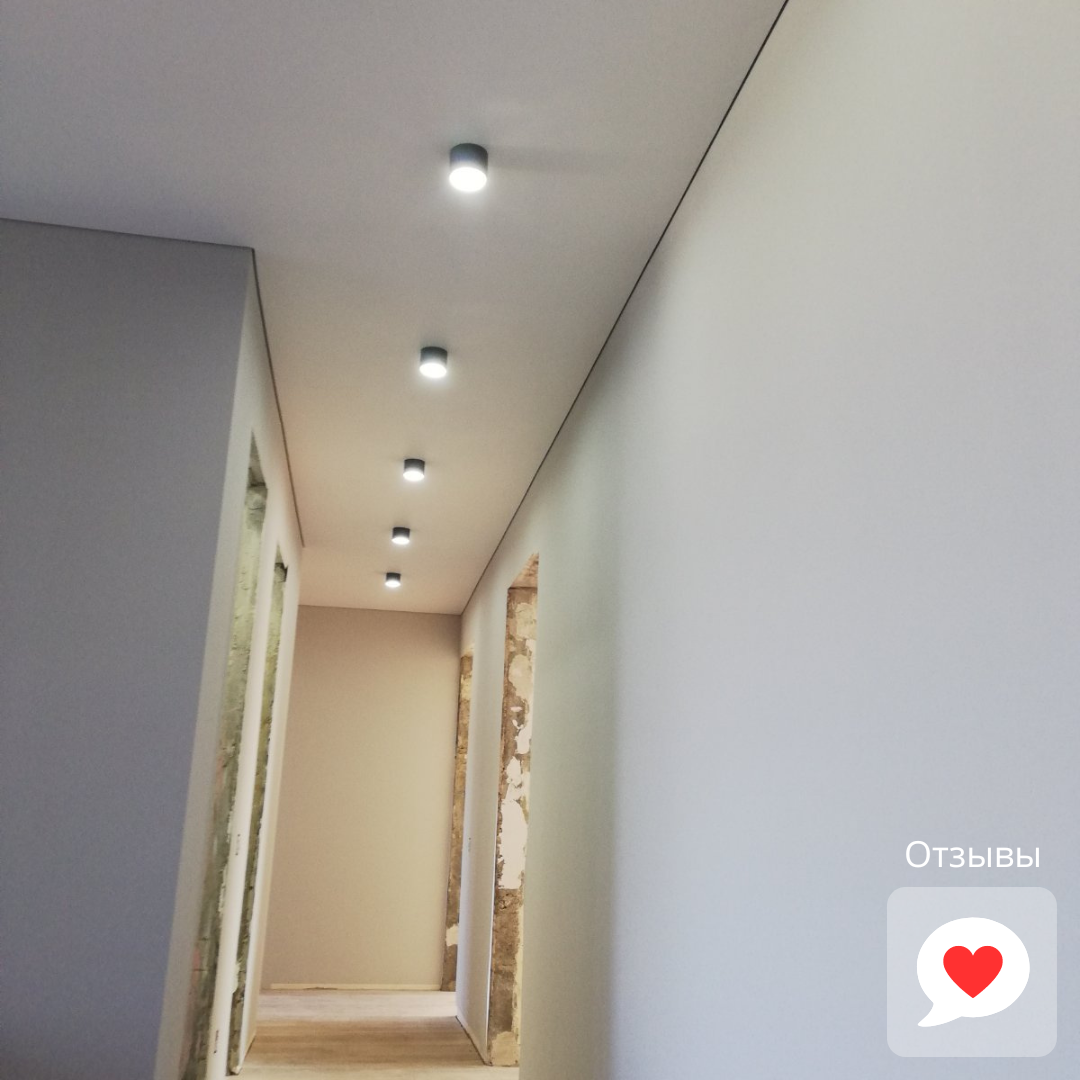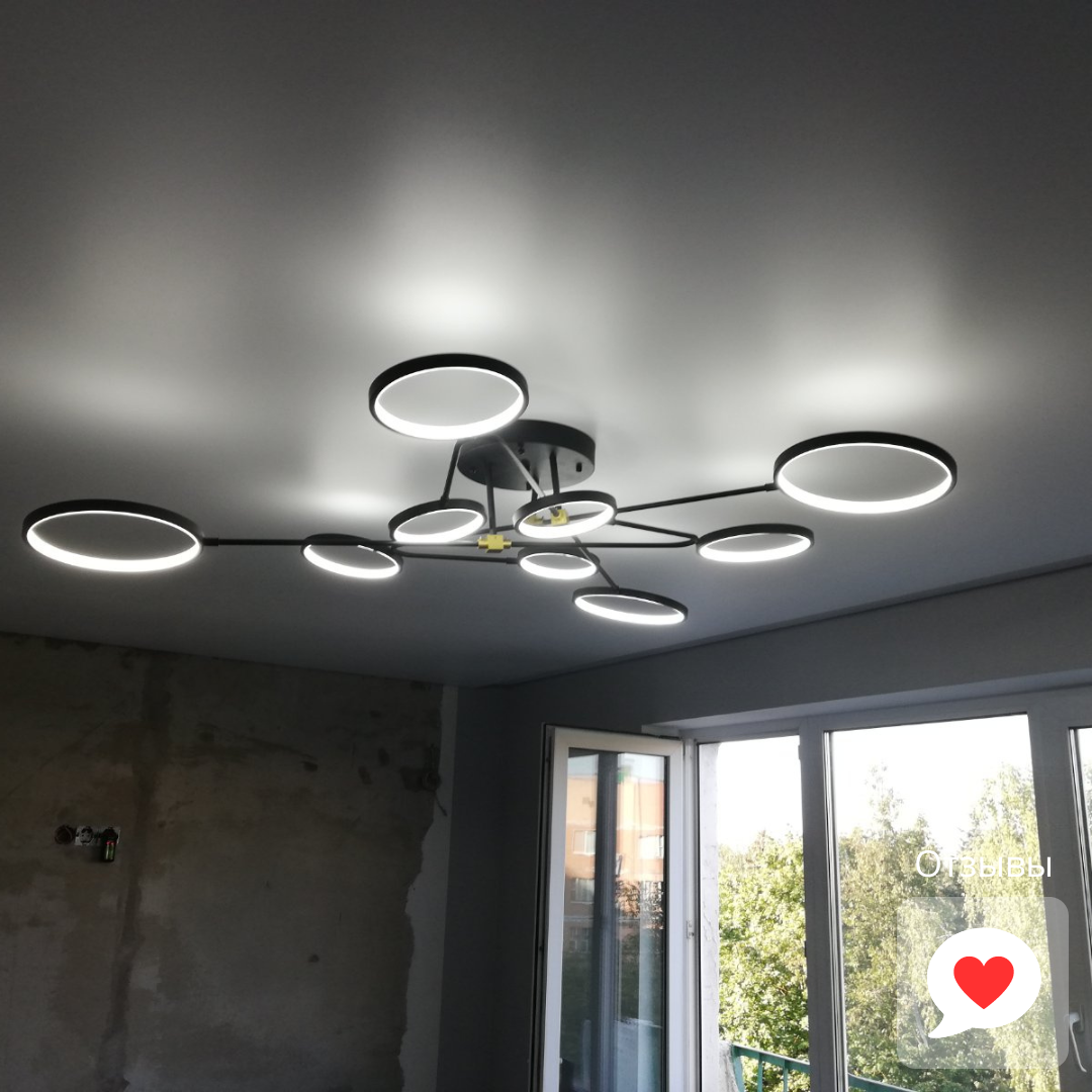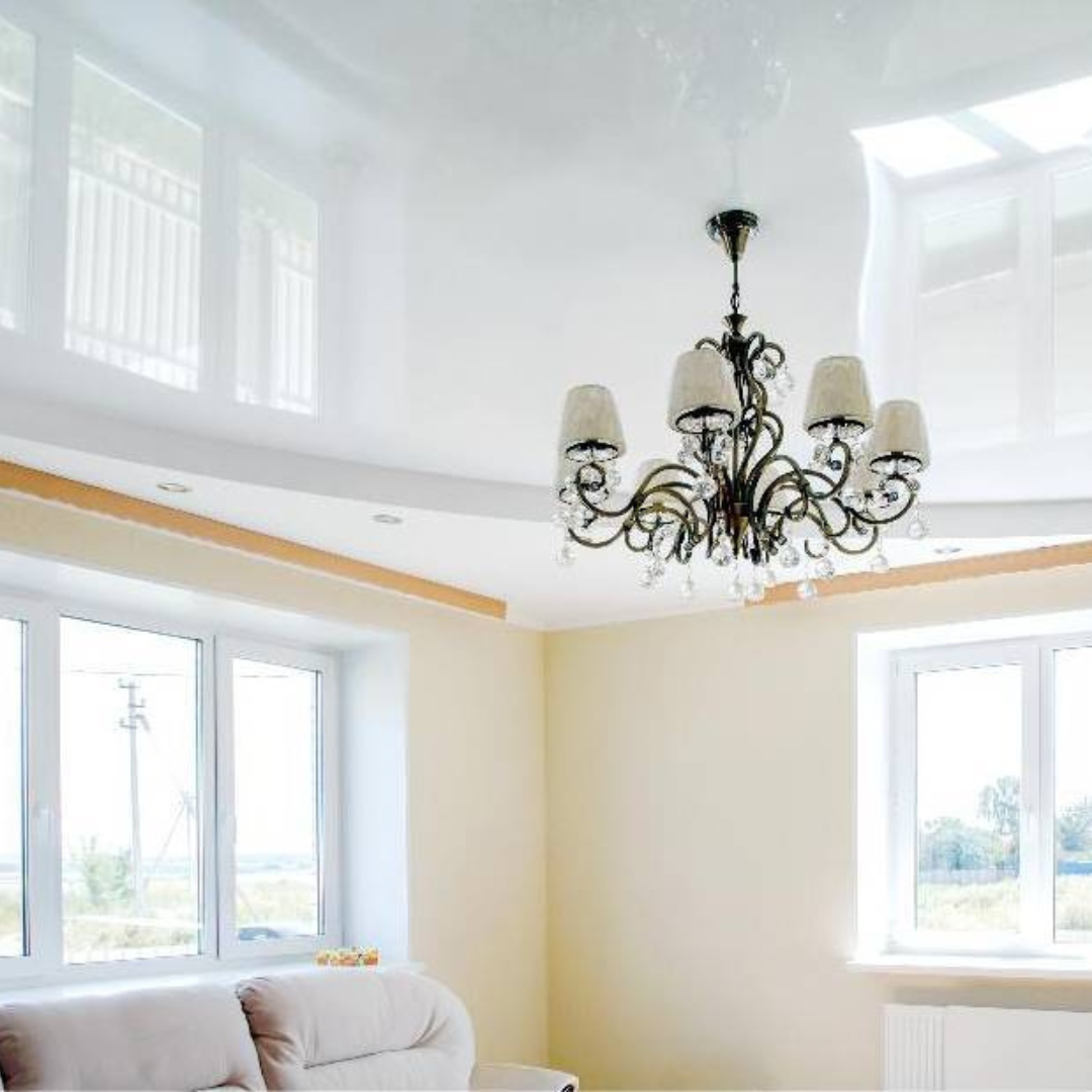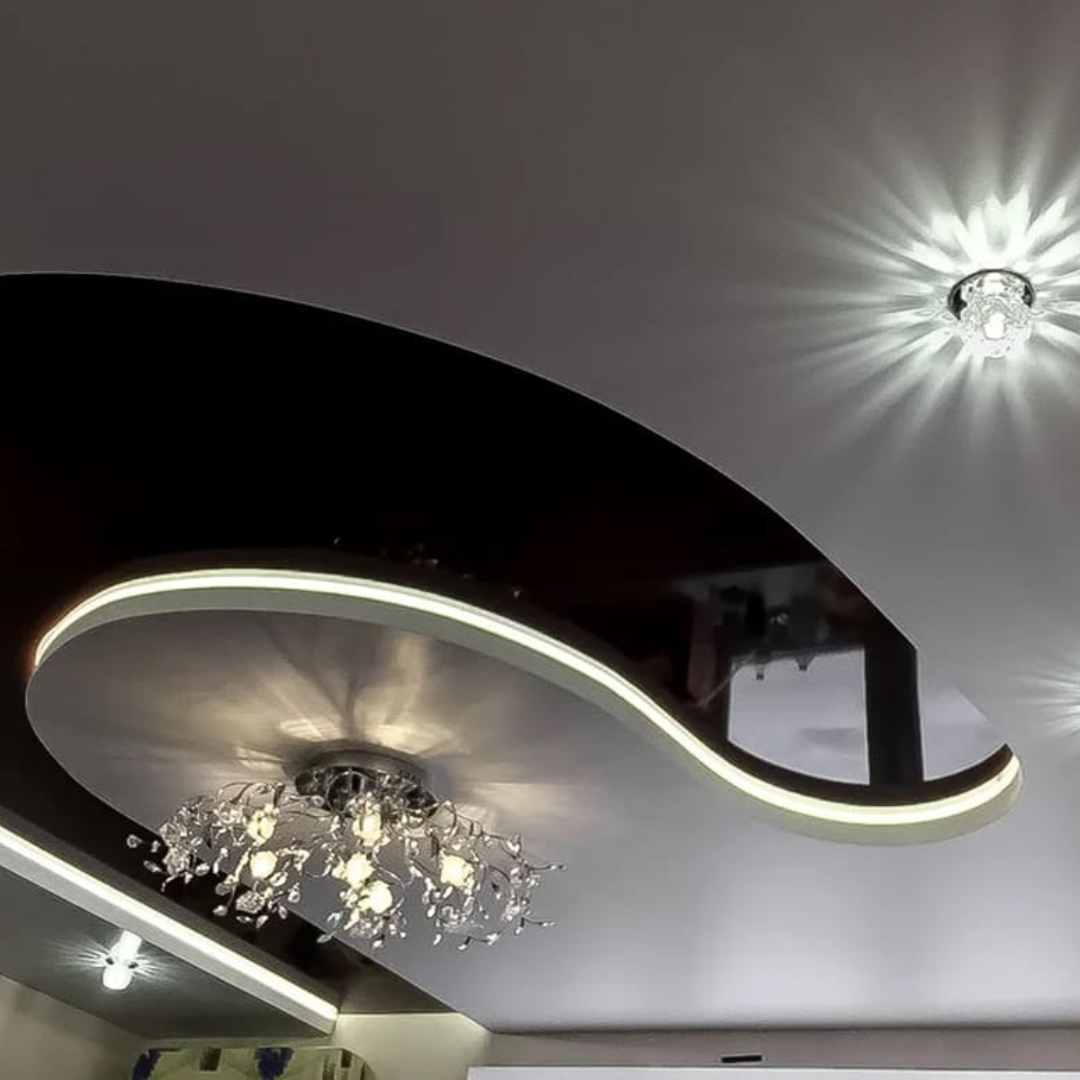 - Монтируем натяжные потолки, подвесные люстры, светодиодные лампы, закрытого типа плафоны и абажуры.