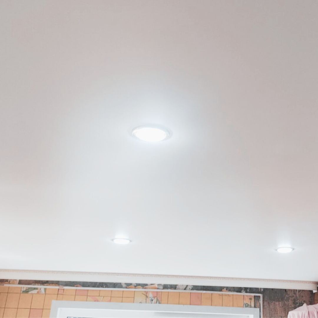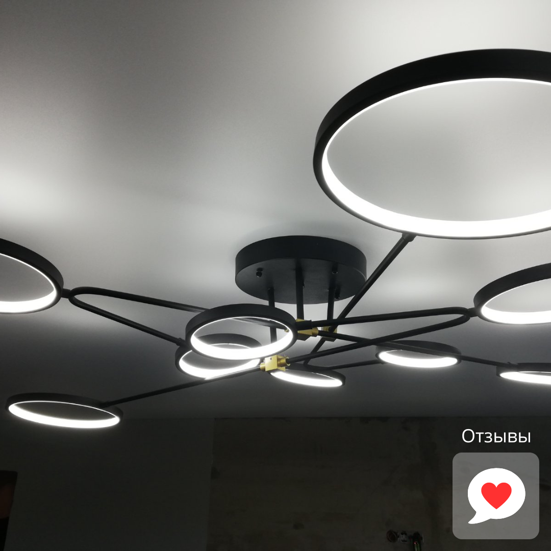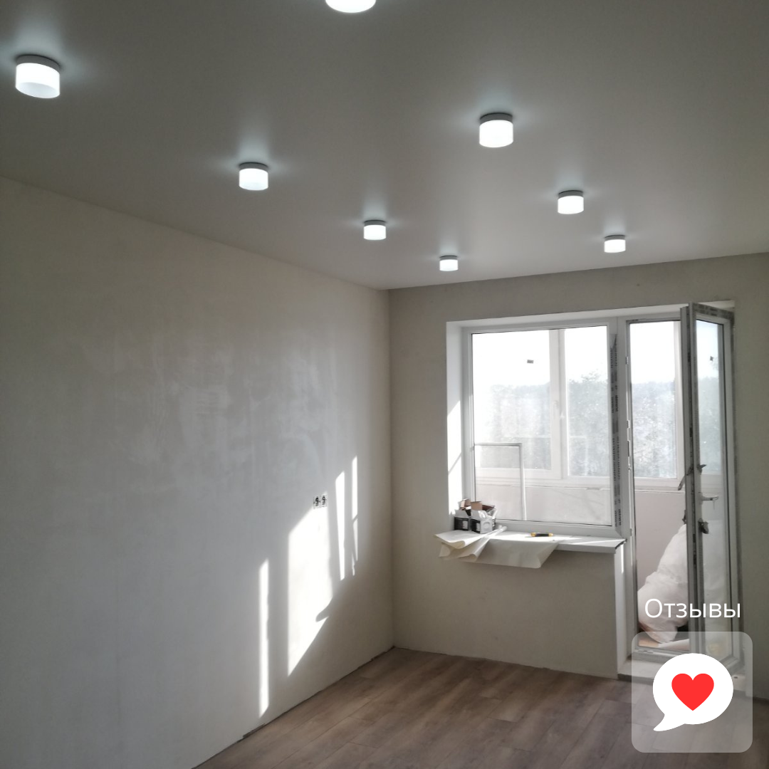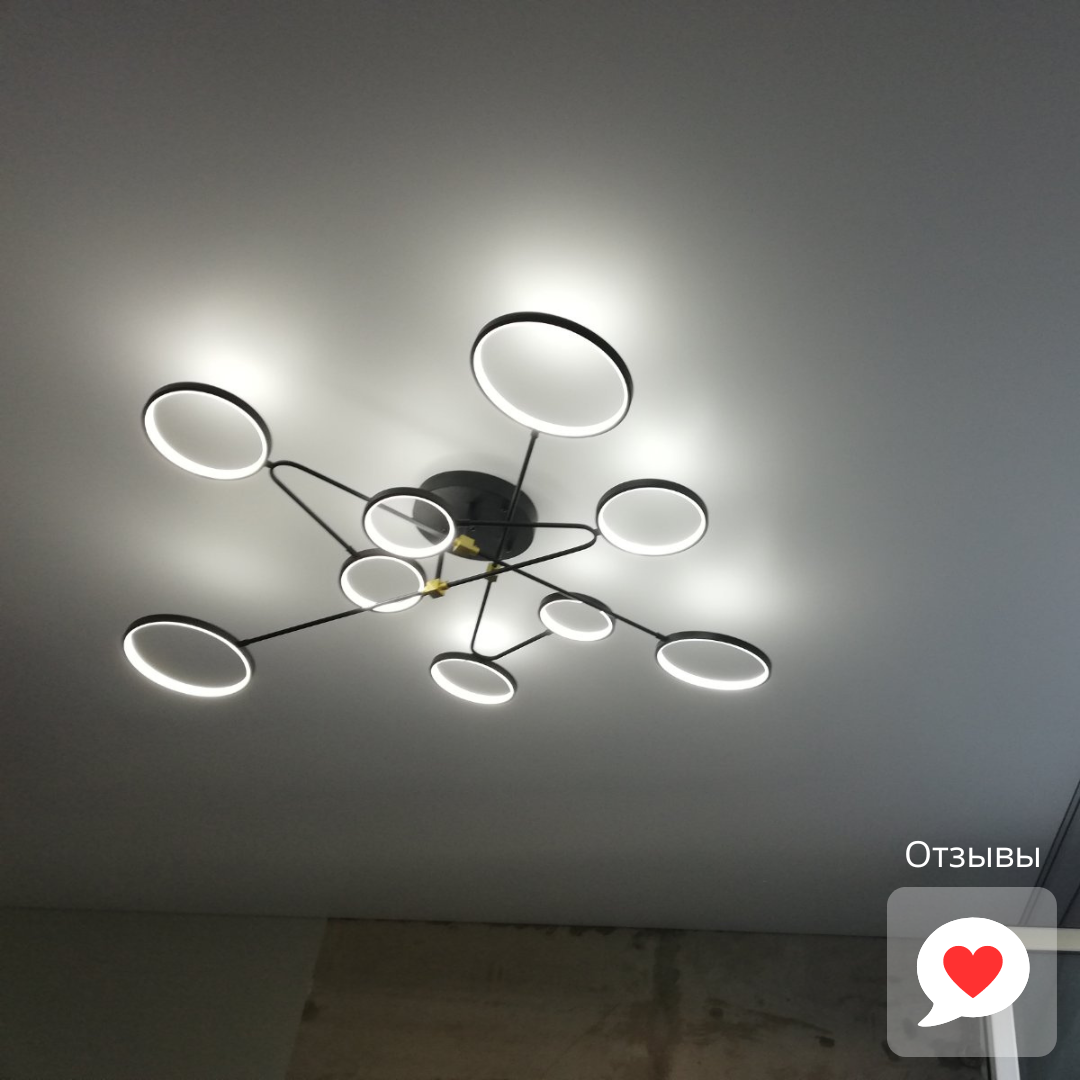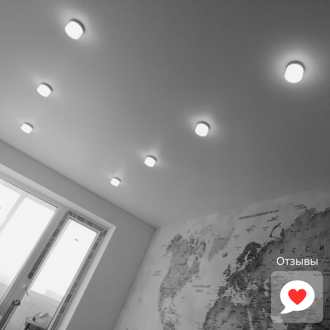 - Монтируем натяжные потолки, подвесные люстры, светодиодные лампы, закрытого типа плафоны и абажуры.