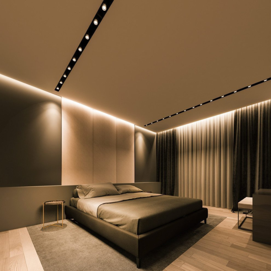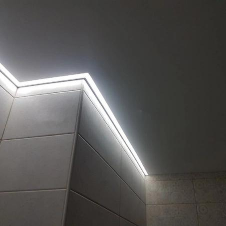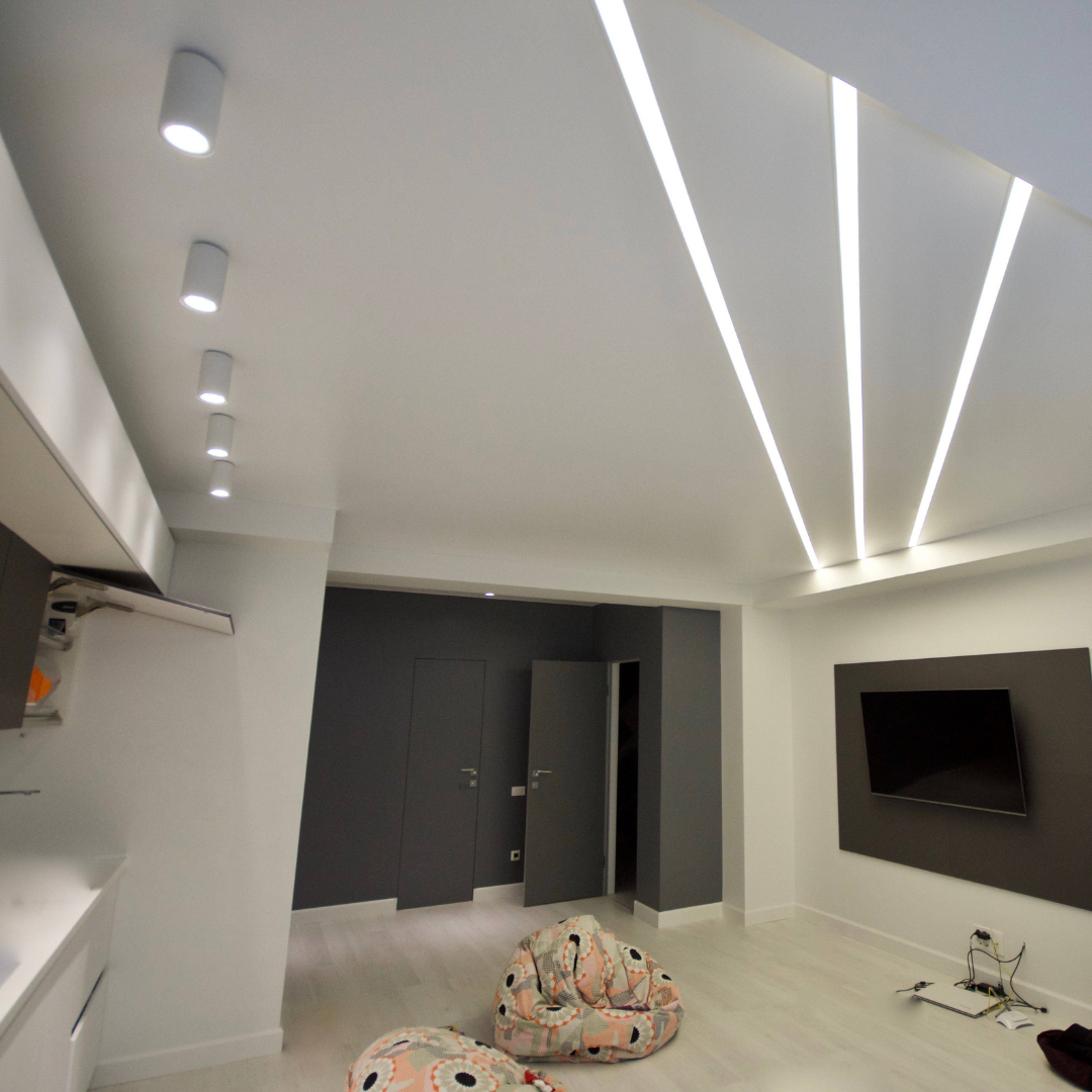 - Возможна подсветка, создание эффекта тени. Установка подсветки без риска для потолка, в том числе в виде светодиодной ленты, которая будет светить на стену и стирать границу между потолком и стеной. Устанавливаем встроенные, накладные светильники, трековые магнитные системы.